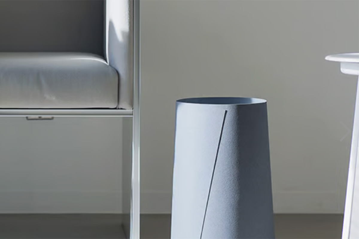 特殊機能再生紙だからこそ生まれるしなやかで革のような質感を生かしたえんとつ型のゴミ箱が、インテリアになじみながら、次の循環の入り口になることを願って作りました。